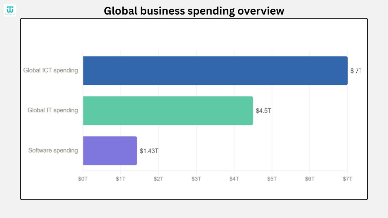 - Businesses will spend over $4–5 trillion on IT, with software alone reaching $1.43 trillion and growing at 14% each year.