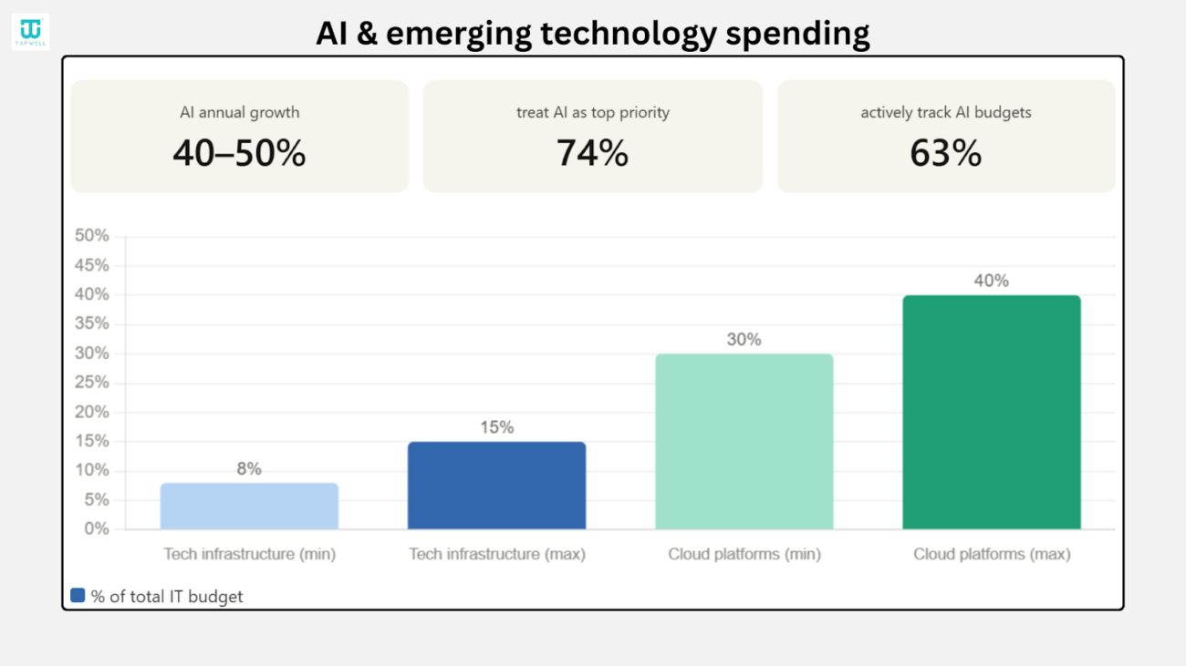 - AI spending is growing 40–50% yearly, as companies shift toward automation.