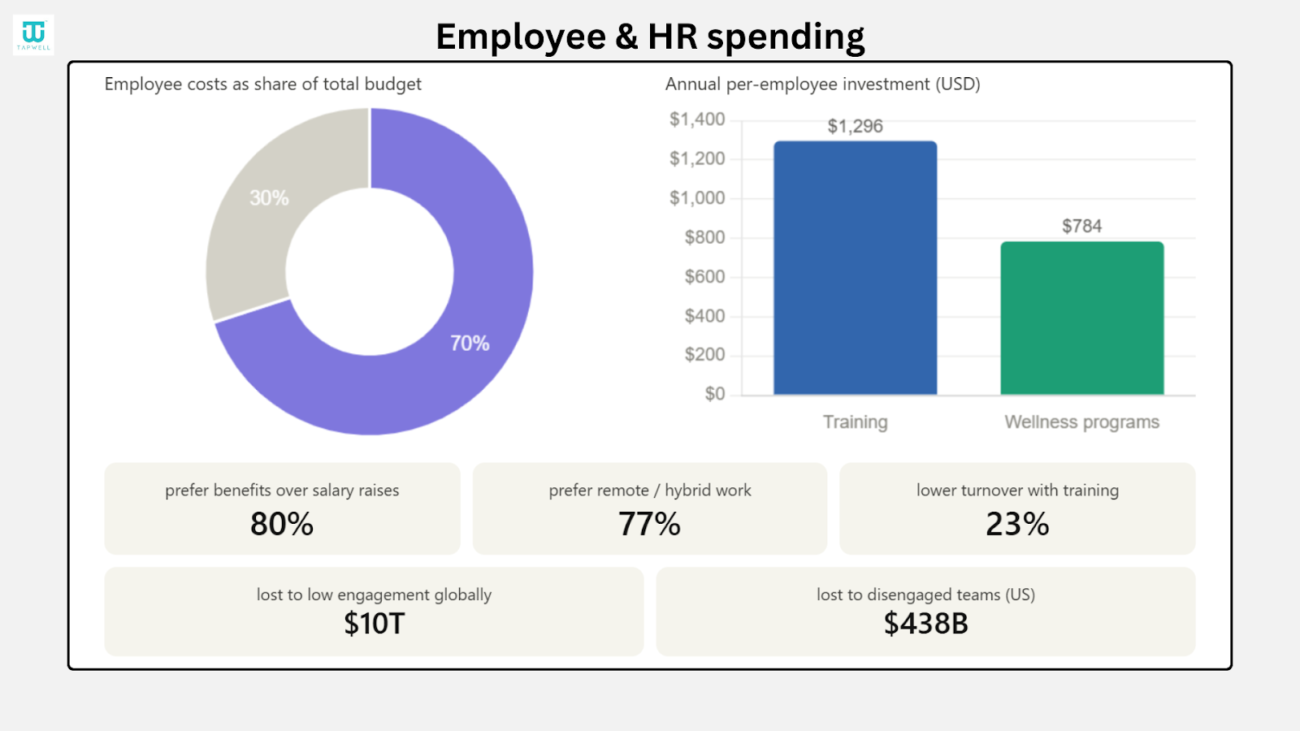 - 70% of total business budgets can go into employee costs, making it the largest spending category.