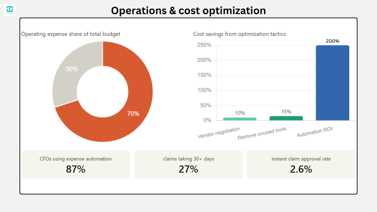 - Expense processes are still slow, and only 2.6% of claims get approved instantly in most companies.
