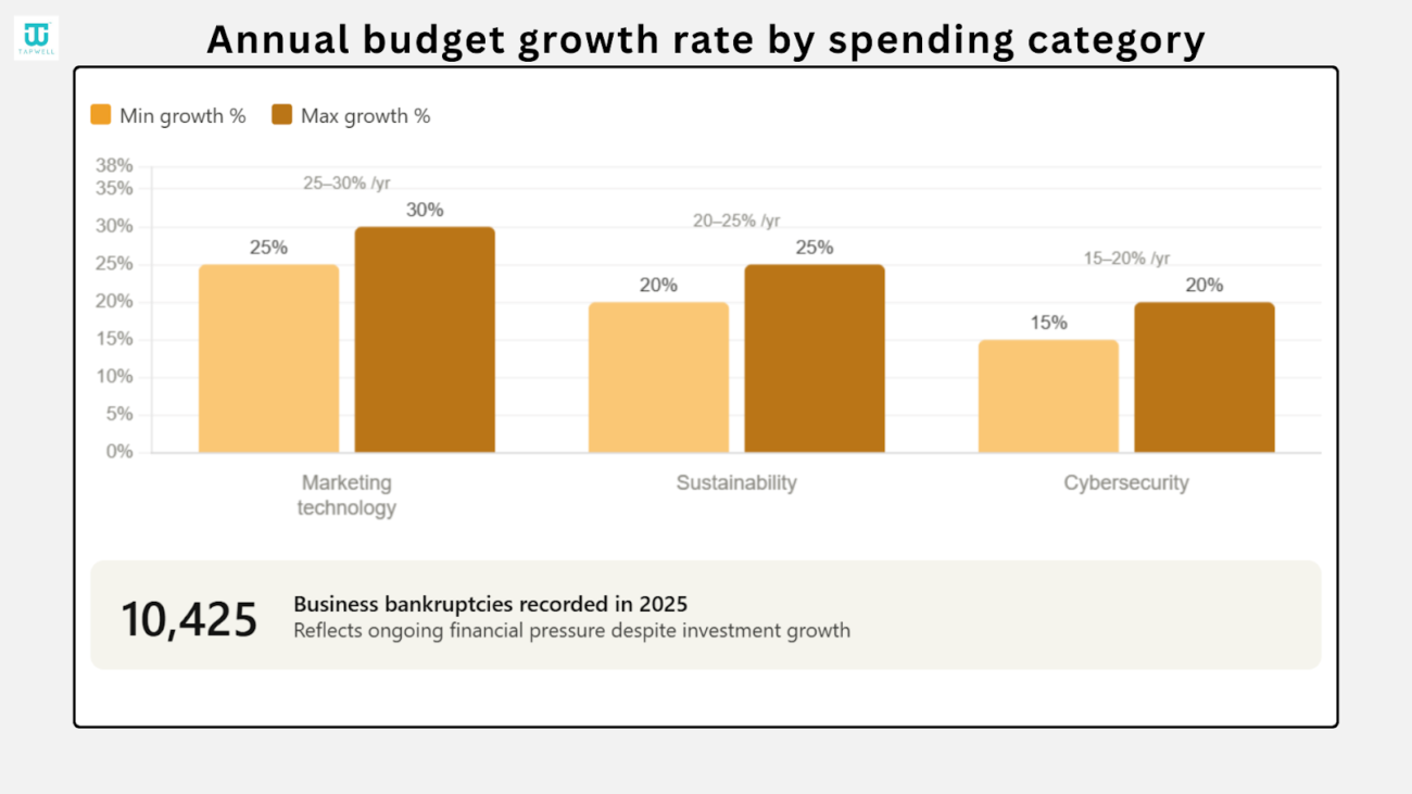 Businesses are increasing their spending on growth and long term strategy. Companies now focus more on expansion, partnerships, and sustainability. These trends show how businesses plan for future growth instead of short term gains.