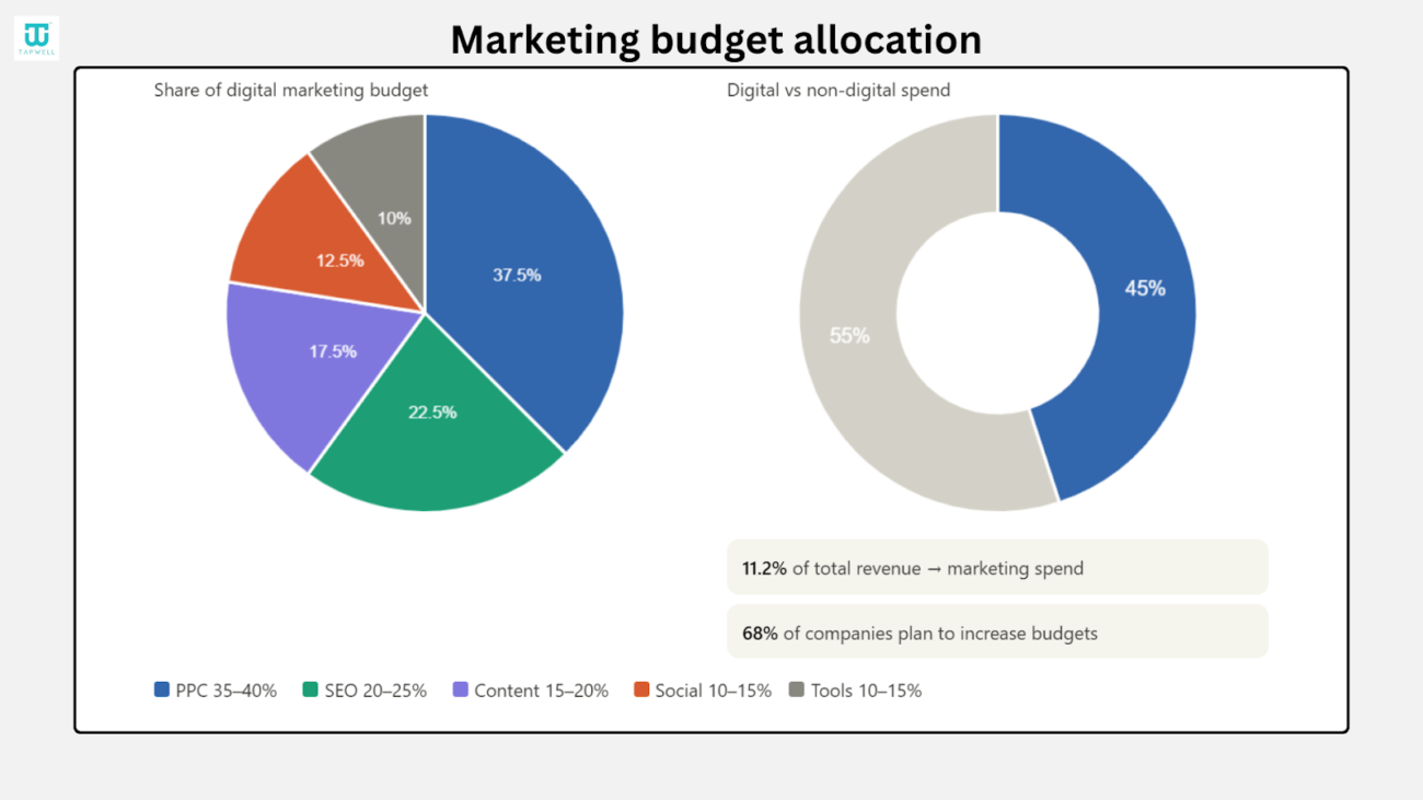 - Digital marketing now takes a major share, as 45% of total marketing budgets go into online channels like search, social, and ads.