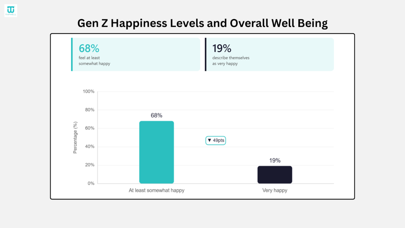 - Only 19% describe themselves as very happy, while 68% say they feel at least somewhat happy in their daily lives.