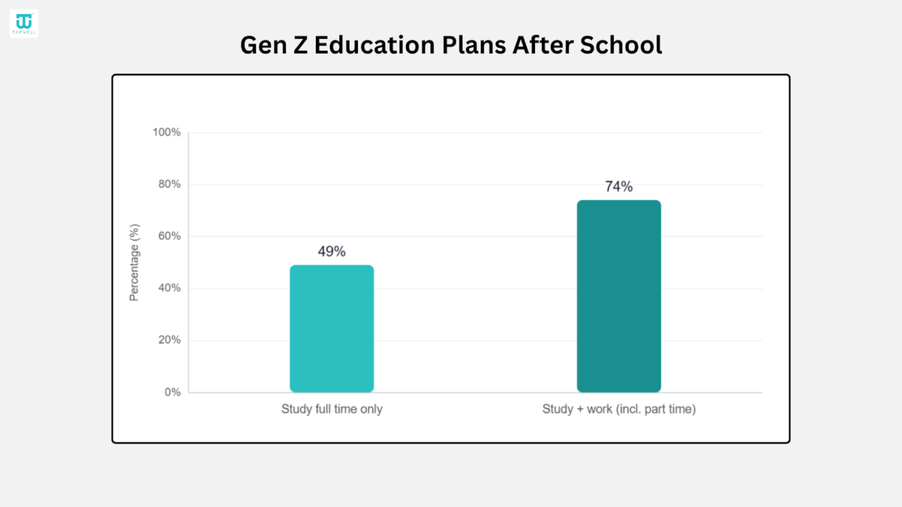 - 49% of Gen Z teens plan to study full time after school, and this increases to 74% when part time study with work is included, which remains lower than Millennials.