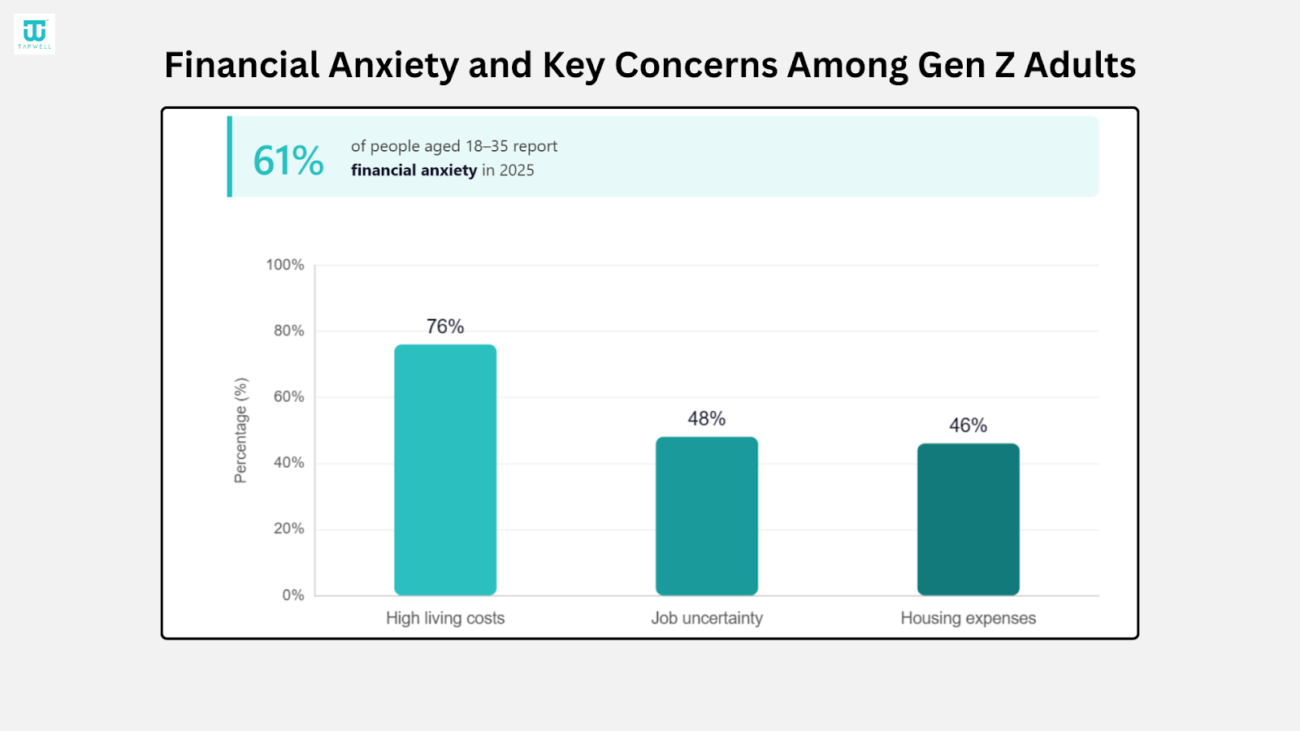 - In 2025, 61% of people aged 18 to 35 report financial anxiety. The main reasons include high living costs (76%), job uncertainty (48%), and housing expenses (46%).