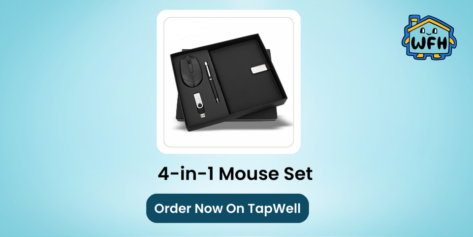 A practical and stylish gift, the 4-in-1 Mouse Set is perfect for remote employees, especially new joiners. The set includes a wireless Bluetooth mouse, a 32GB pen drive, a black diary, and a metal pen—essentials for a smooth work-from-home experience.
