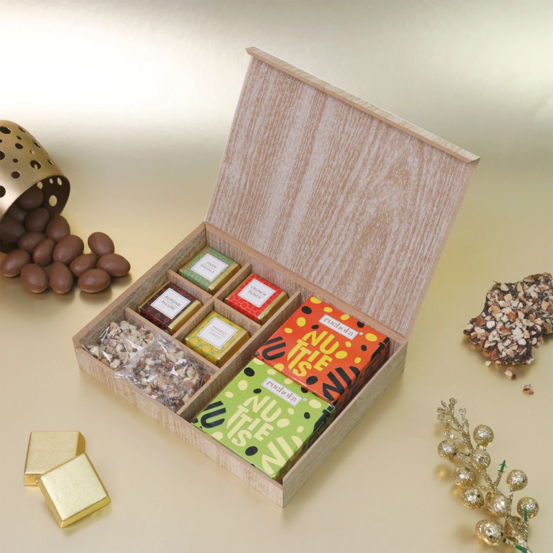 This delightful treats hamper comes in a sturdy and elegant gift box that looks rich and presentable. The hamper includes four different treats, such as Paan Masala, Orange Aura, Almond Praline, and Almond Nutties. The selection offers a mix of sweet and nutty flavors that suit different taste preferences.