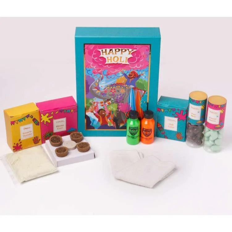 This compact Holi celebration bucket includes herbal gulal for safe color play, thandai powder for festive drinks, and balloons to add extra fun to office celebrations. All items come packed in a reusable bucket that keeps everything organized and easy to carry. The colors are skin-friendly and suitable for eco-conscious celebrations.