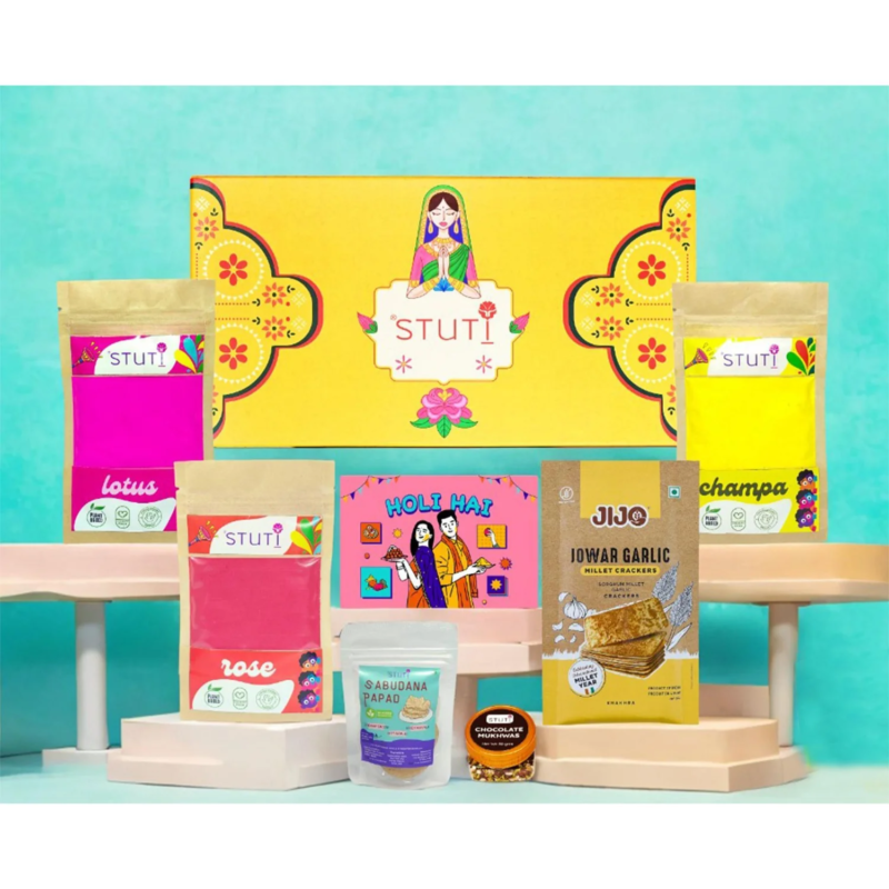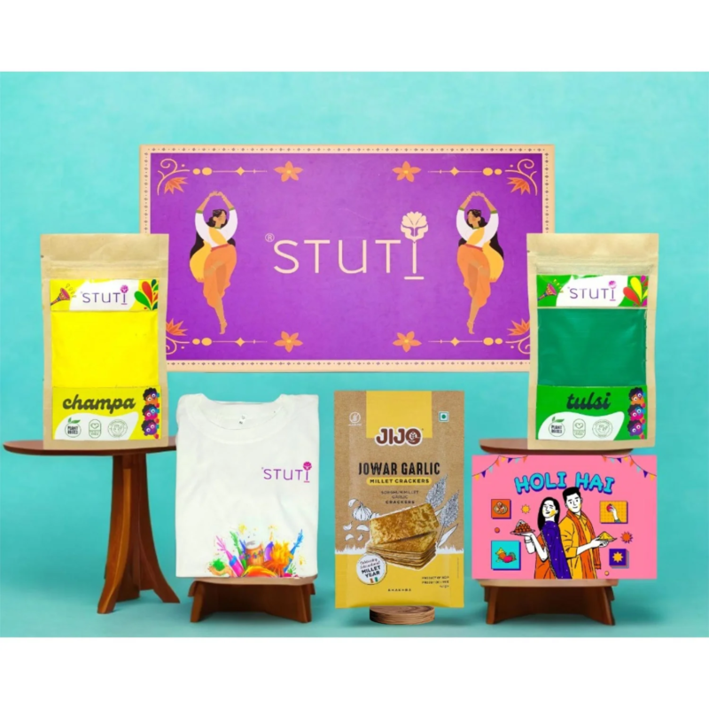 This personalised Holi gift box includes two packs of natural gulaal in Tulsi and Champa fragrances, 80 grams each. It also comes with 40 grams of jowar garlic millet khakra for a healthy festive snack. The box includes a free size Holi T-shirt that employees can wear during office celebrations and a Holi riddle card to add fun interaction.