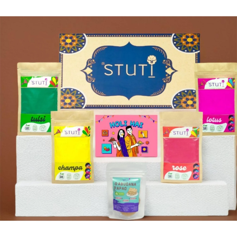 This Holi gift hamper includes four packs of natural gulaal in Tulsi, Champa, Rose, and Lotus fragrances. Each pack contains 80 grams of skin friendly colors made for safe celebration in the office. The set also includes 16 grams of sabudana papad for a light festive snack and a fun Holi riddle card to create team engagement.