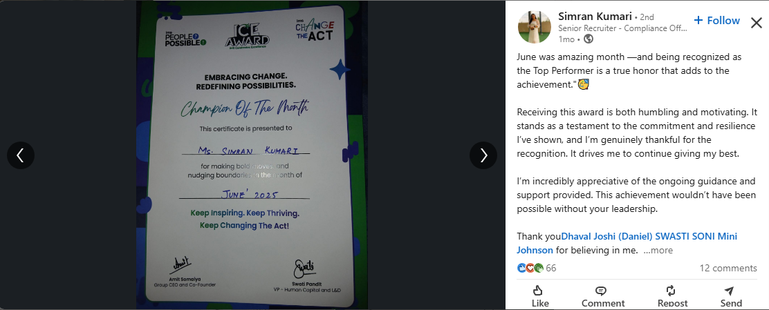 For example, we saw this post on LinkedIn, where an employee is thrilled to share her achievement to the public. This acts as a booster for her future performance.