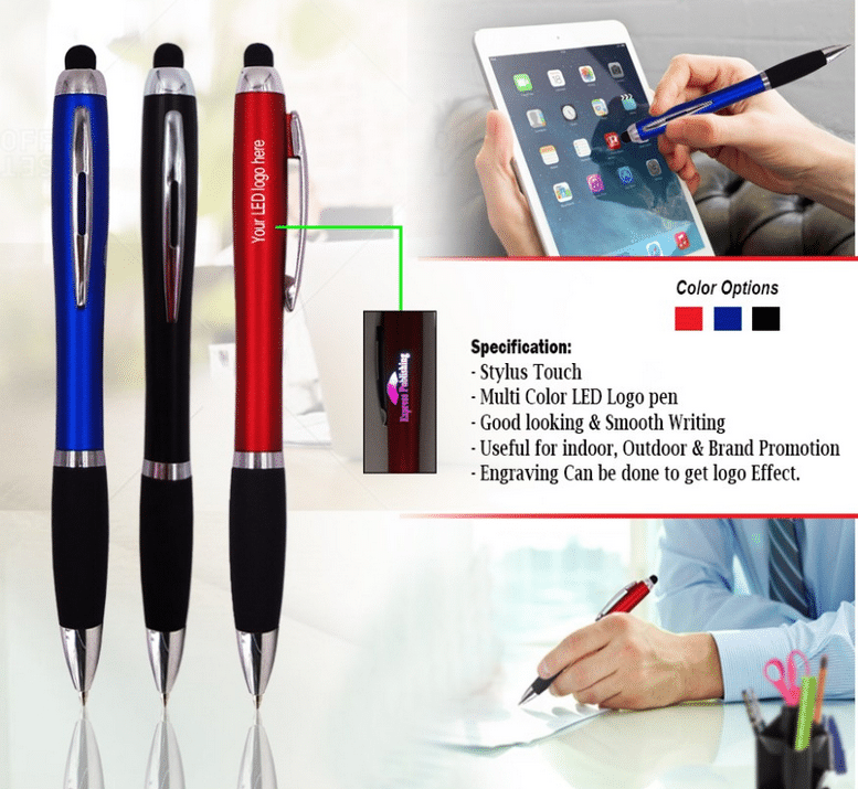 This 2 in 1 Multi Color LED Ball Pen is a smart and stylish promotional gift. It features a stylus touch for screens, smooth writing, and a multi-color LED logo that glows when you press the button.