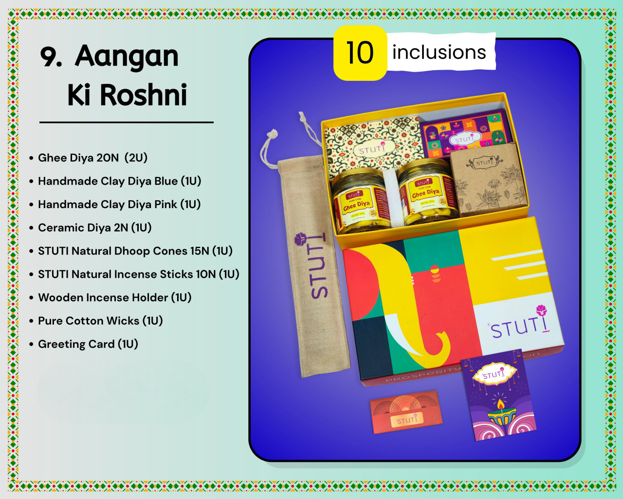Combines ghee diyas, colorful handmade diyas, ceramic diyas, incense sticks & cones, a wooden incense holder, cotton wicks, and a greeting card — a complete festive decor kit that’s both premium and thoughtful.