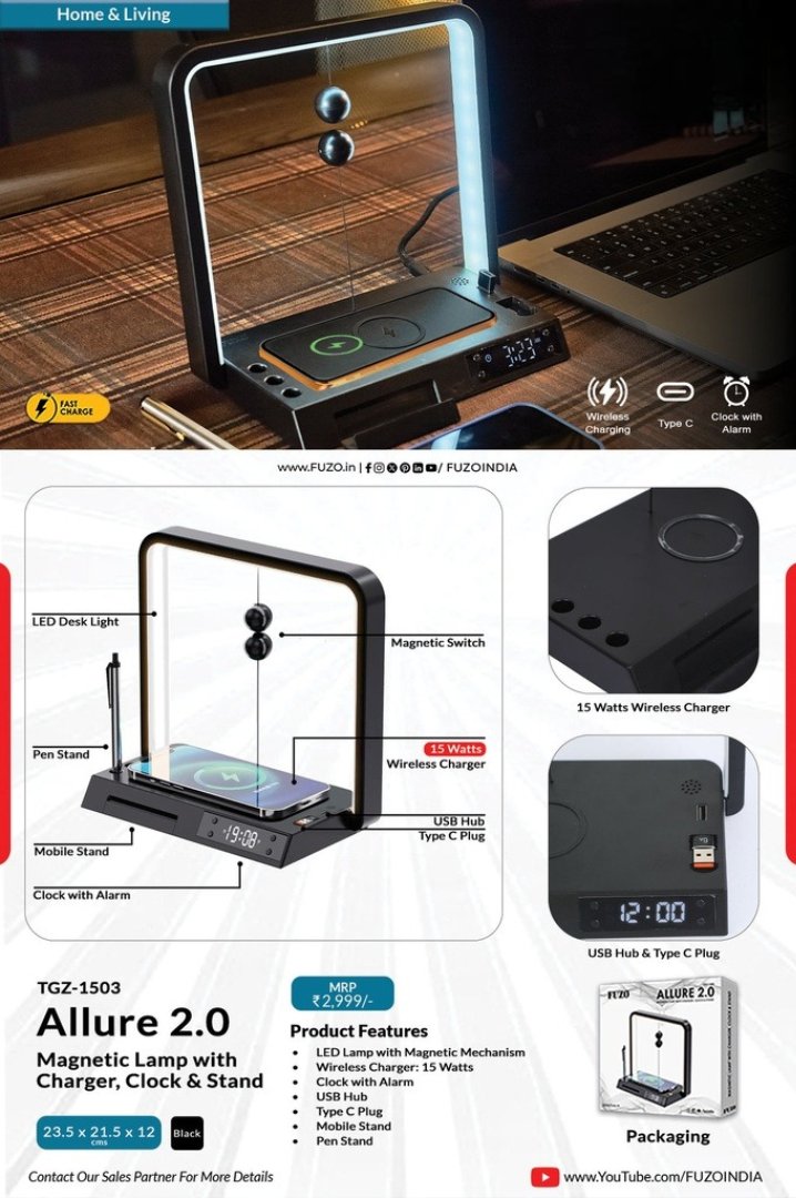 Allure 2.0 – Magnetic Desk Lamp with Wireless Charger, Clock & Stand