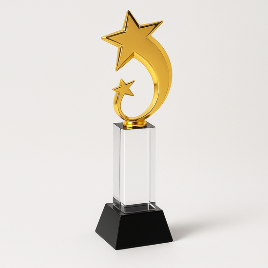 The Custom Crystal Gold Star Award Trophy is a striking choice for recognizing top performers and celebrating milestones. With a black wooden base, a clear crystal body, and a gold star on top, it offers a premium look that stands out in any award ceremony or event setup.