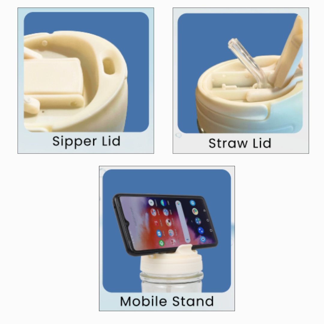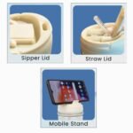 - Features: Dual lid (sipper and straw), built-in mobile stand, handle, heat-resistant sleeve