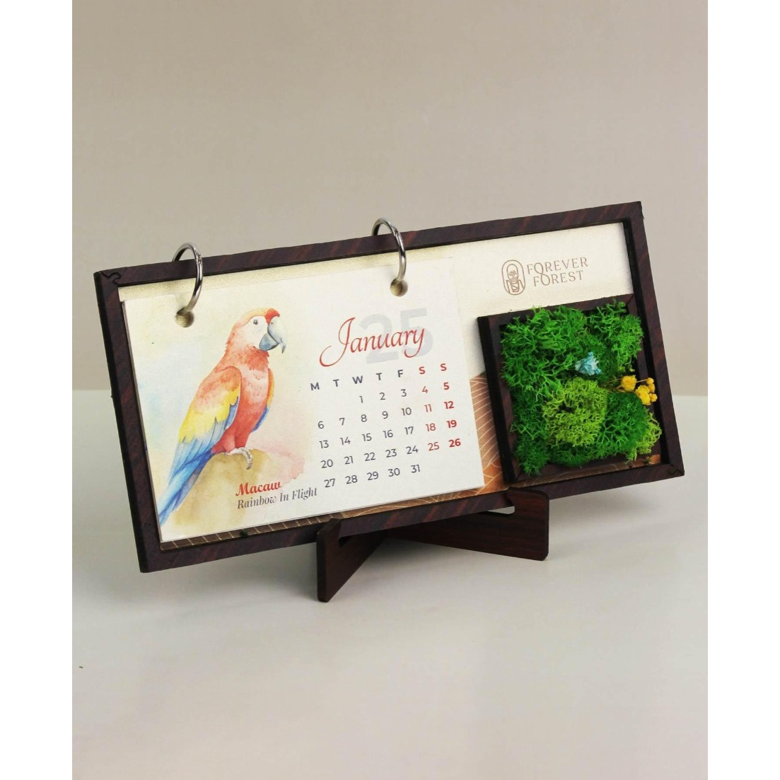 The Forest Edge Calendar is a premium corporate gift, combining functionality with natural elegance. Featuring silver prints of birds and blooms, it is enhanced with a forest tile of preserved moss and flowers, bringing a touch of nature to any workspace.