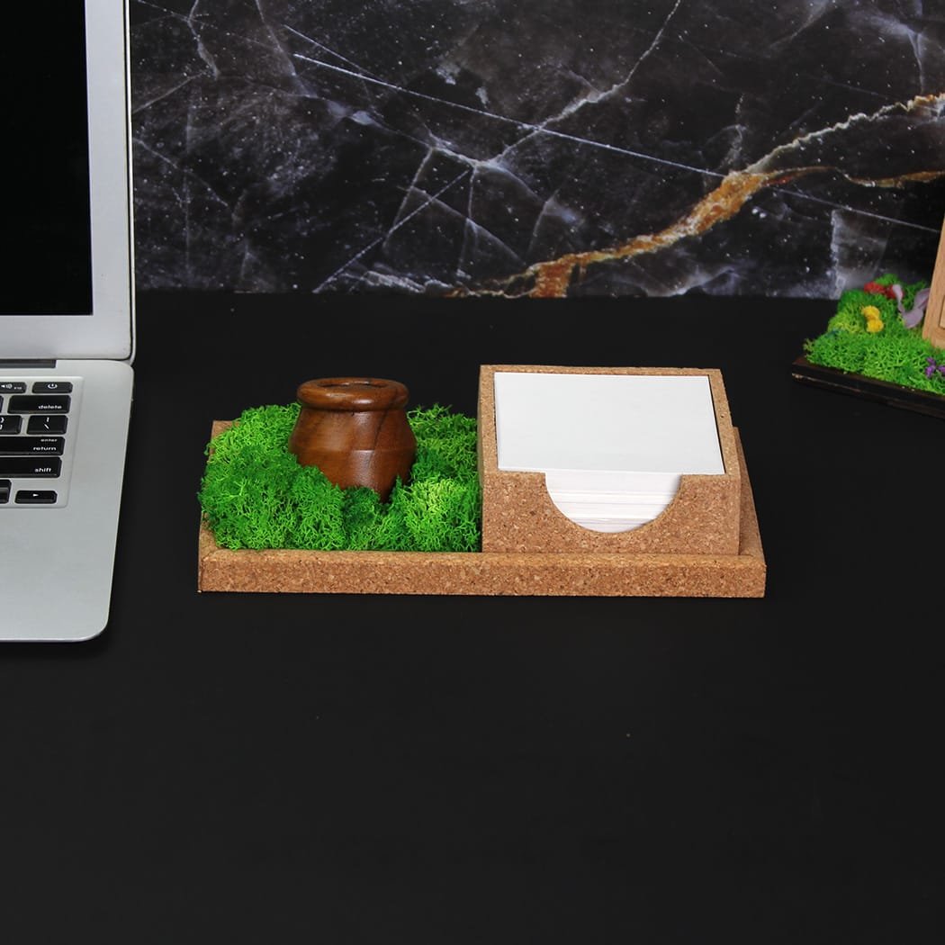 This compact desk companion features preserved moss, a handcrafted wooden pen stand modeled on classic inkwells, and a tray for note cards or essentials. It’s designed to bring nature to the workspace while offering everyday utility. Its natural textures and nostalgic design evoke calm, creativity, and a break from the digital grind. Elegant yet grounded, it enhances both corporate and home offices alike.