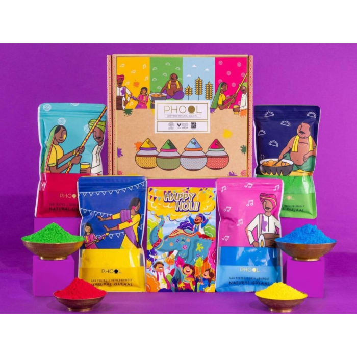 This Holi gift hamper includes 100g of natural gulaal in four vibrant shades—Pink, Yellow, Blue, and Green, ensuring a safe and joyful Holi experience. Each set comes with a Skin Safety Certificate, guaranteeing the use of non-toxic, skin-friendly colors, along with a Holi Greeting Certificate to add a festive touch.