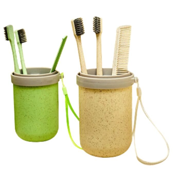 It is available in green and light brown colors. It is compact and lightweight and fits easily into work bags, backpacks, or travel pouches, making it the perfect travel companion for employees and clients on the go. Inside, it comes with two toothbrushes made with charcoal-infused bristles for better oral hygiene and a sturdy comb for daily grooming.