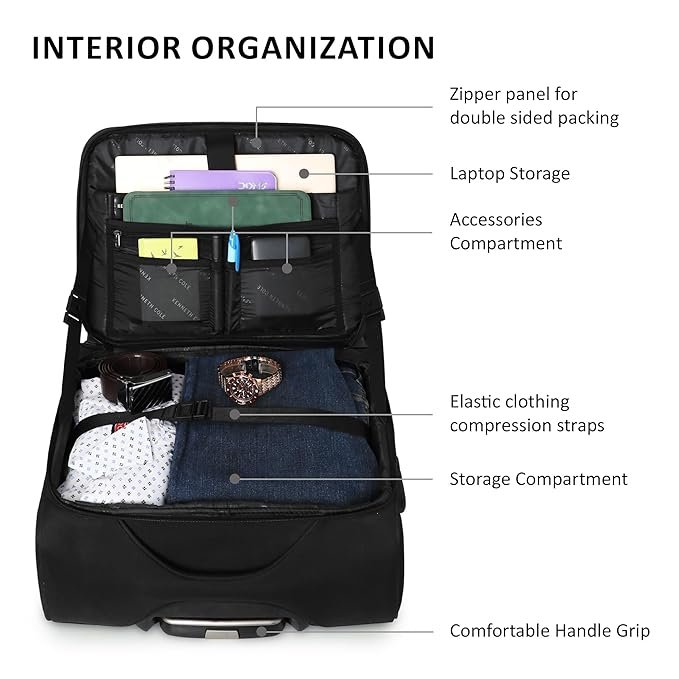 Spacious & organized interior allows for wrinkle-free packing of clothes and essentials