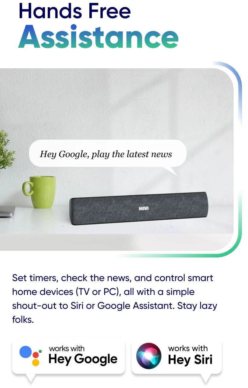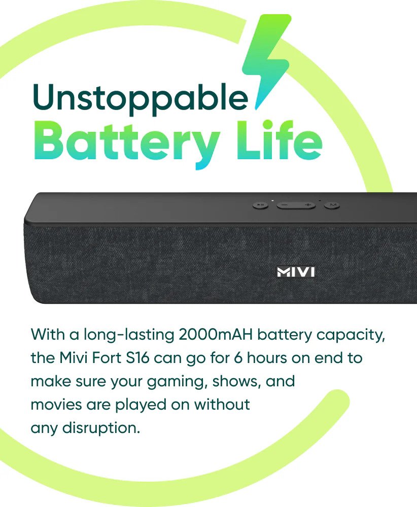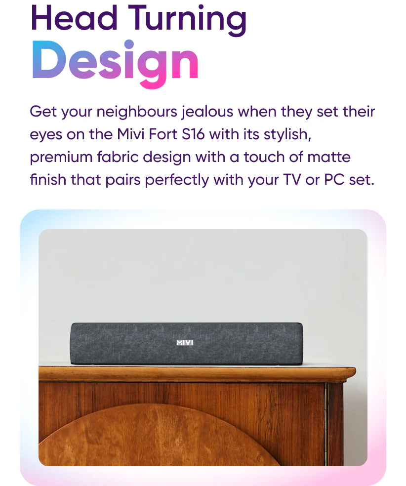 Transform your everyday entertainment with the Mivi Fort S16 — a compact 16W soundbar that delivers powerful, room-filling audio in a stylish package. Designed to turn heads, the Fort S16 features a sleek premium fabric design with a smooth matte finish that complements your TV, PC, or work desk perfectly — adding a modern touch to any space.