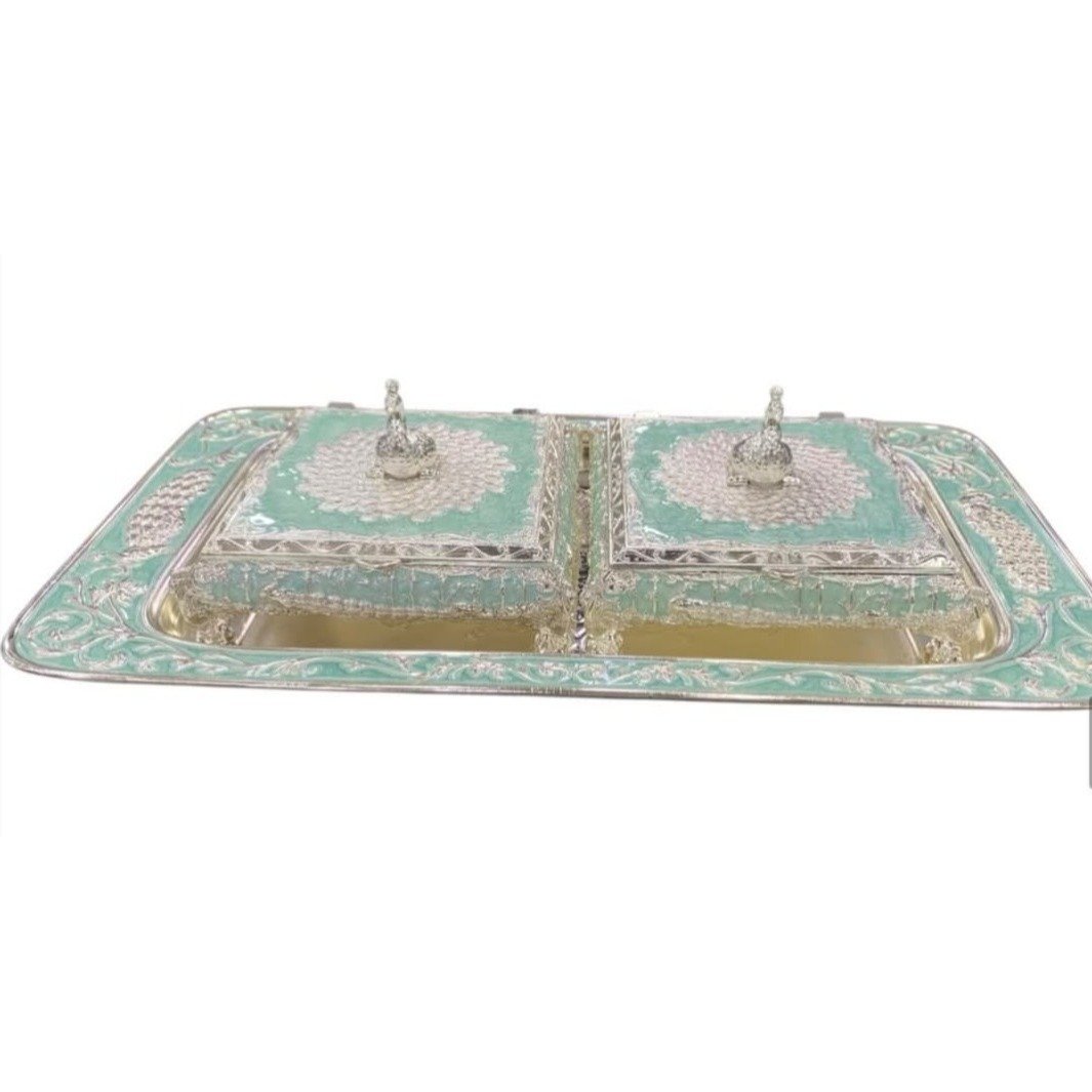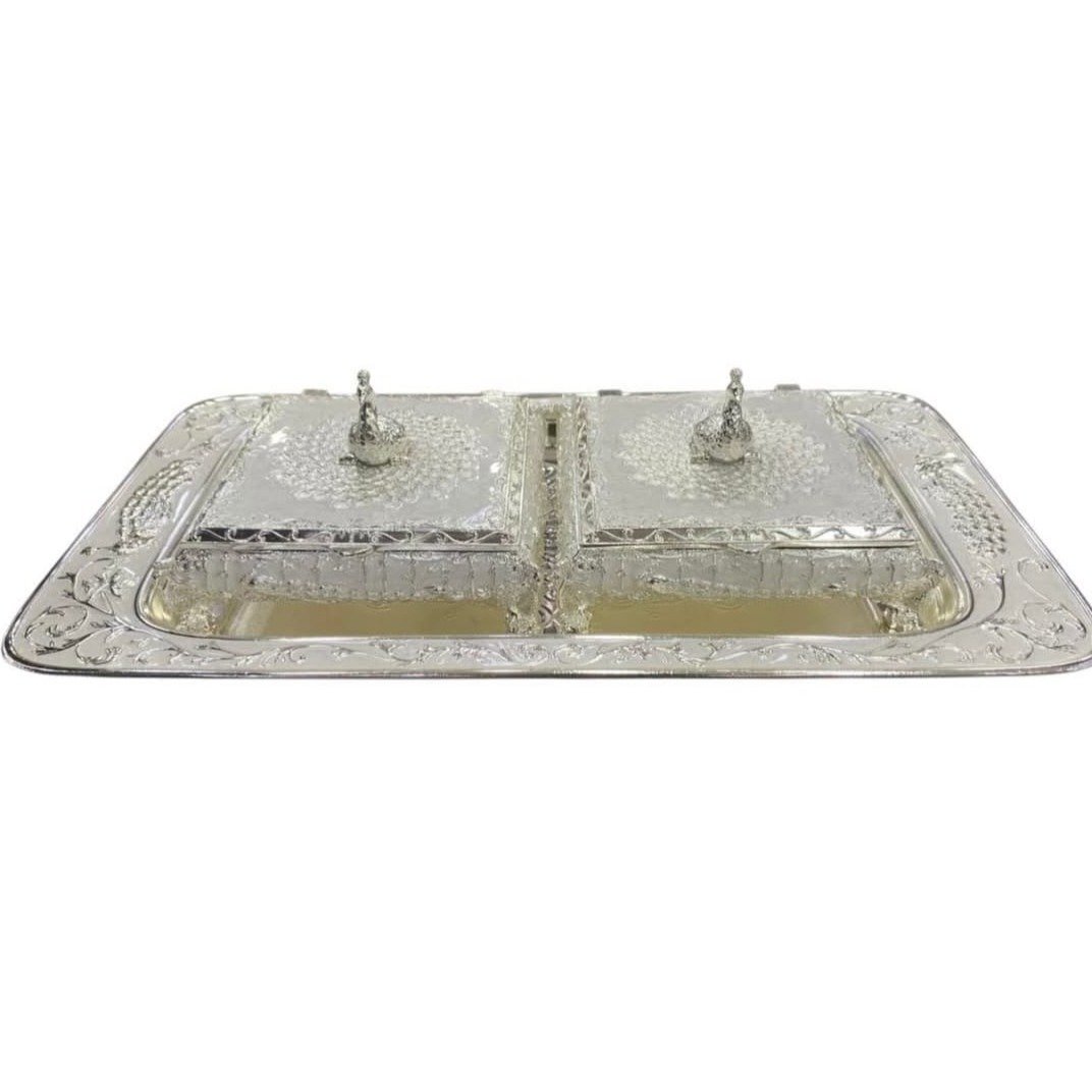 The ornate craftsmanship, paired with its functional double jar format, allows it to be used for serving dry fruits, sweets, mukhwas or as a décor piece. It reflects a sense of premium luxury and Indian heritage, ideal for Diwali hampers or executive gifting.