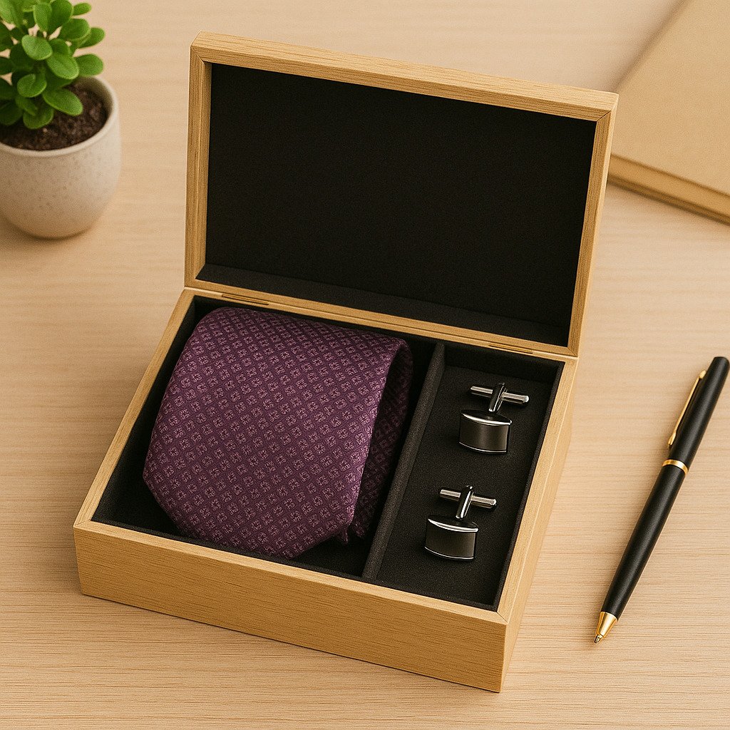 This elegant gift set includes a finely crafted micro-pattern tie and a matching pair of sleek cufflinks, beautifully presented in a premium wooden box. The set exudes class and functionality, making it an impressive addition to any formal wardrobe. It’s the perfect blend of practicality and luxury — sure to be appreciated and remembered.