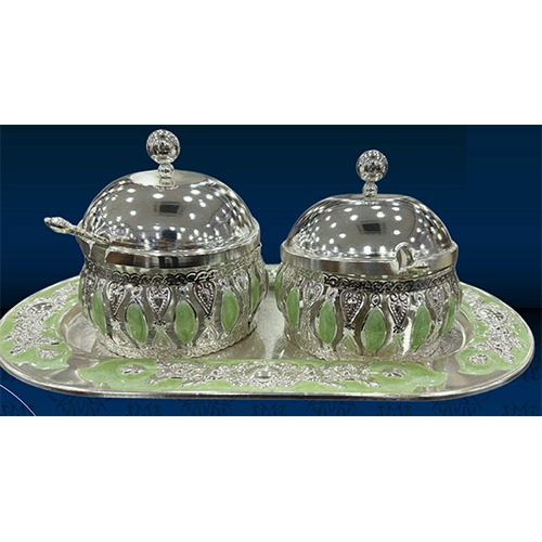 Yes, Silver Enamel Bowl Set with Tray & Spoons can be customised with your company’s logo. Please get in touch with us at (+91 9769378543) for specific customisation options.