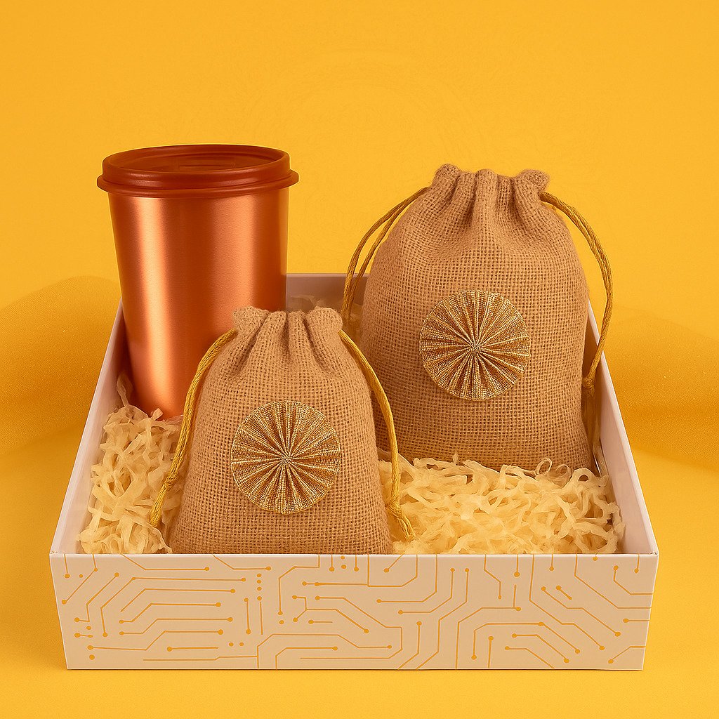 It’s a thoughtful balance of health and elegance. The tumbler serves as a long-lasting daily-use gift, and the premium dry fruits are perfect for festive snacking. The eco-friendly jute potlis elevate the presentation and align with sustainable gifting trends.