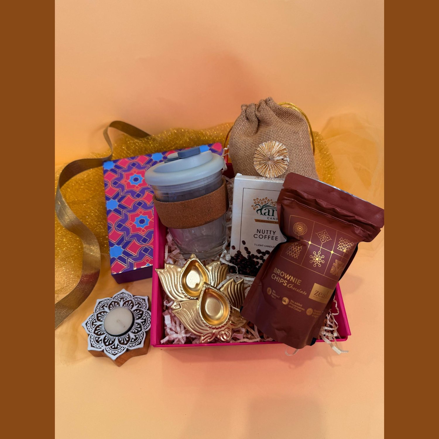 The TapWell Oak & Aroma Delight Diwali Hamper is a stylish and practical Diwali potli gift, perfect for employee gifting. It features an elegant oak-finish mug, a serving of healthy dry fruits, a pack of brownie chips, and a set of 6 coffee-scented candles that add a warm festive touch. Each item is curated to blend utility with festive charm.