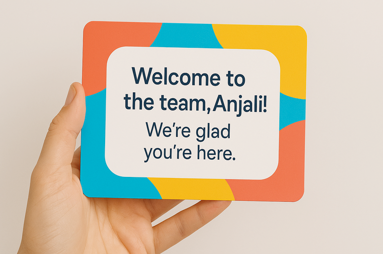 A message card doesn’t need to be long or overly formal. It just needs to feel genuine. You can mention how excited the team is to have them on board, share a quick note from the manager or founder, or even include a short team inside joke or cultural value that reflects your work environment. These small things often stay with employees long after the first day.